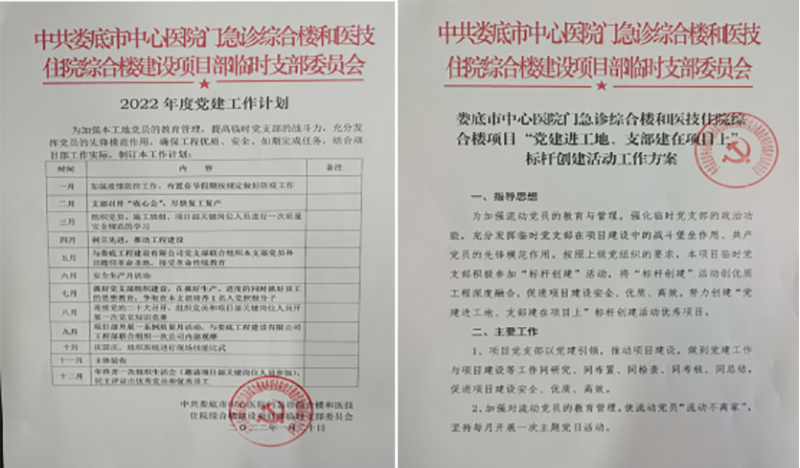該項(xiàng)目地處婁底市最繁華街道的十字路口,又是婁底市最大的單體建筑公共項(xiàng)目。項(xiàng)目中標(biāo)后,公司立即配備優(yōu)秀骨干組建項(xiàng)目部班子,并成立了中共婁底市中心醫(yī)院門急診綜合樓和醫(yī)技住院綜合樓建設(shè)項(xiàng)目部臨時支部委員會,推舉項(xiàng)目經(jīng)理姚春旭擔(dān)任臨時黨支部書記,并安排了黨建指導(dǎo)員。該支部目前有黨員8人。項(xiàng)目部設(shè)置了黨員活動室,文化走廊等,臨時黨支部“五化”建設(shè)達(dá)標(biāo)。